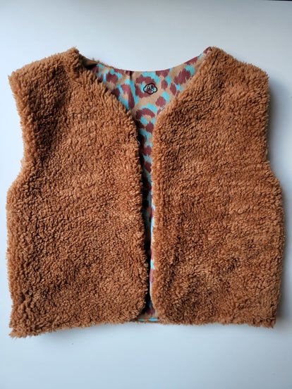 Een heerlijk gilet van bruine teddy stof en een lief katoenen stofje met bloemetjes aan de binnenkant! Super leuk om te dragen over een jurkje of een basic shirtje.
