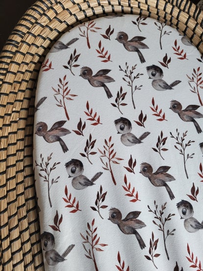 Deze verschoonhoes kan gebruikt worden in de kinderwagen of rondom het matrasje van een verschoonmandje van bijvoorbeeld de kwantum. Print: vogeltjes.