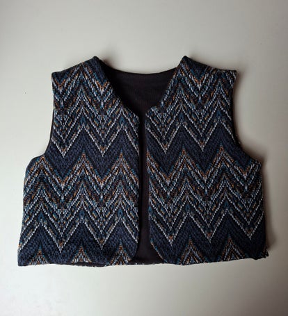 Een stijlvol gilet met een gebreid golvend stofje met gouden draadjes aan de buitenkant en een katoenen stofje aan de binnenkant. Leuk om een outfit mee af te maken!
