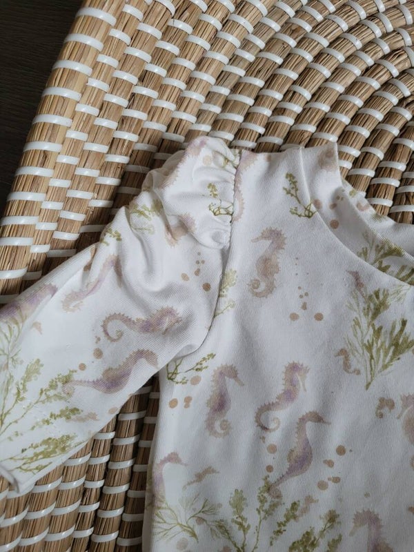 Dit jurkje is echt een pareltje! Een gerimpeld 3/4 mouwtje, een rimpelrok en een super zoet stofje met zeepaardjes erop. En ook nog eens super uniek, want hier wordt er maar 1 van gemaakt! Gaat jouw kindje hier straks in stralen? 95% katoen, 5% elastan.