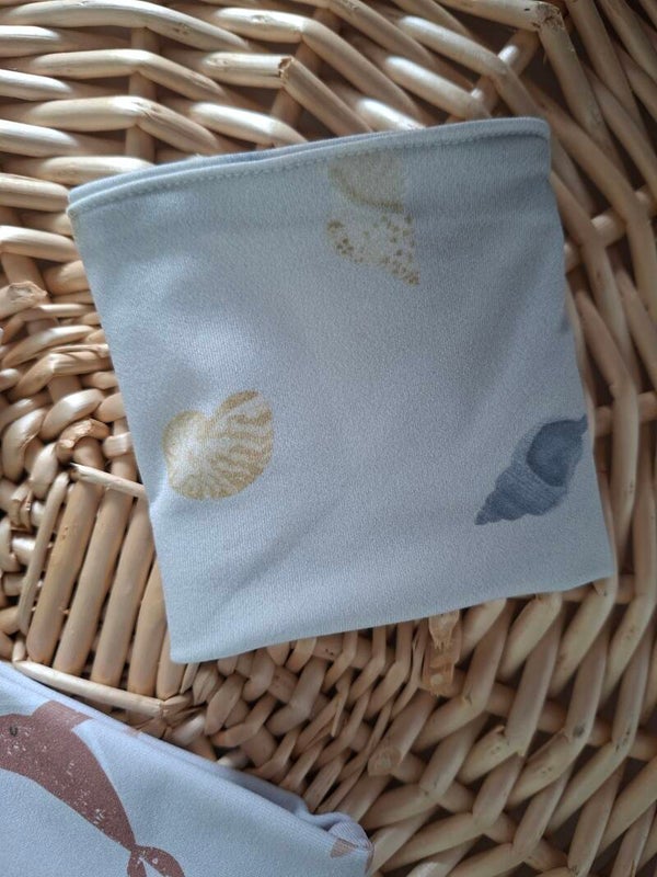 Beschermband met een print van schelpen. Achtergrondkleur is lichtblauw.