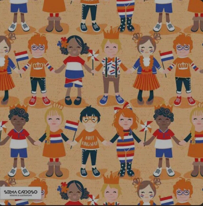 Een tof broekje met een heel vrolijk printje van allemaal verschillende kindjes. De achtergrondkleur is oranje.