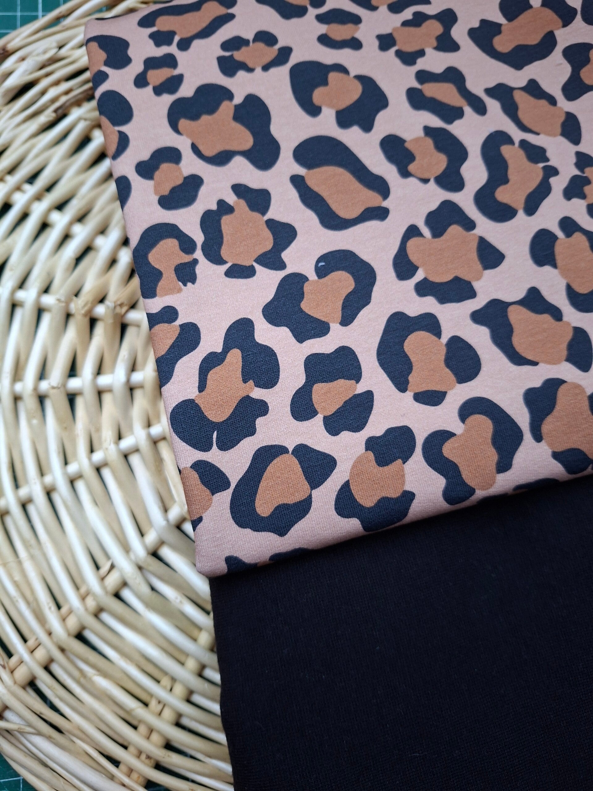 Een tof stofje in een bruine panterprint. Het ribstofje onderaan gebruik ik voor de boorden.