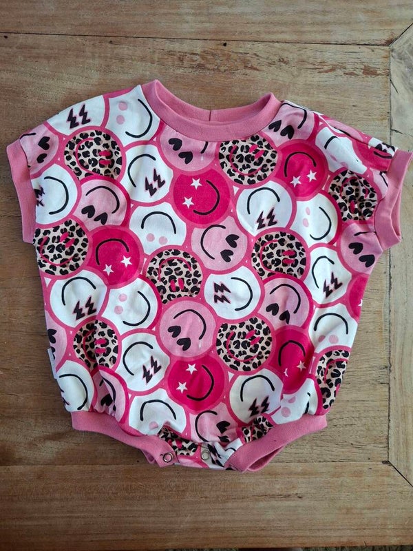 Een hele leuke sweaterromper met smiley's en panterprint. Voor de boorden kun je kiezen uit zwarte of roze stof.