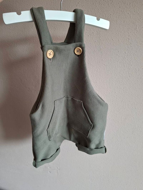 - Tuinbroekje houten knoopjes, zakje op de voorkant, omgeslagen boorden. Korte broek. Khaki wafelstof. Maat 62/68. €25,95