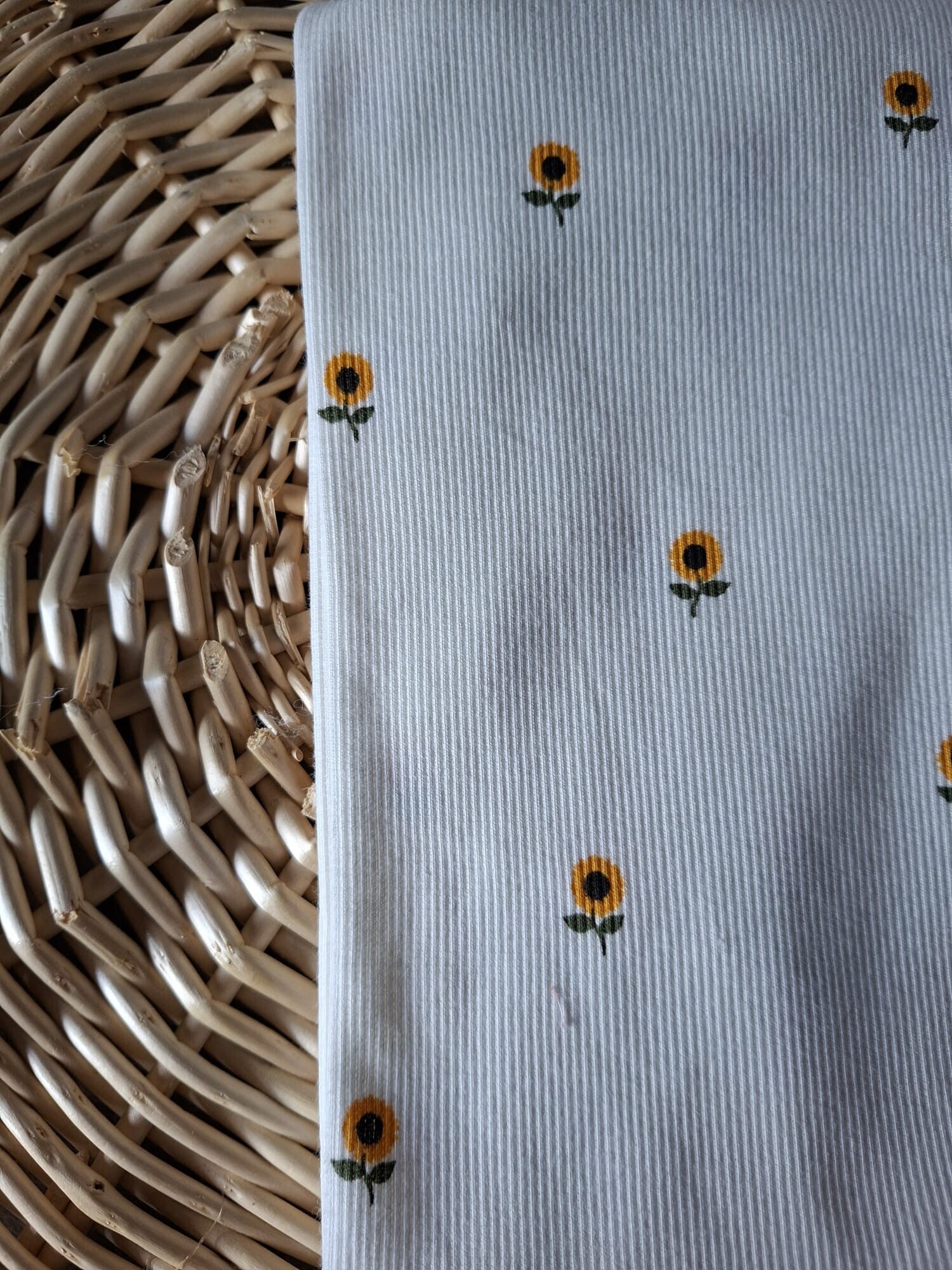 Een ribstofje met kleurige zonnebloemen.Samenstelling: 95% katoen, 5% elastan.