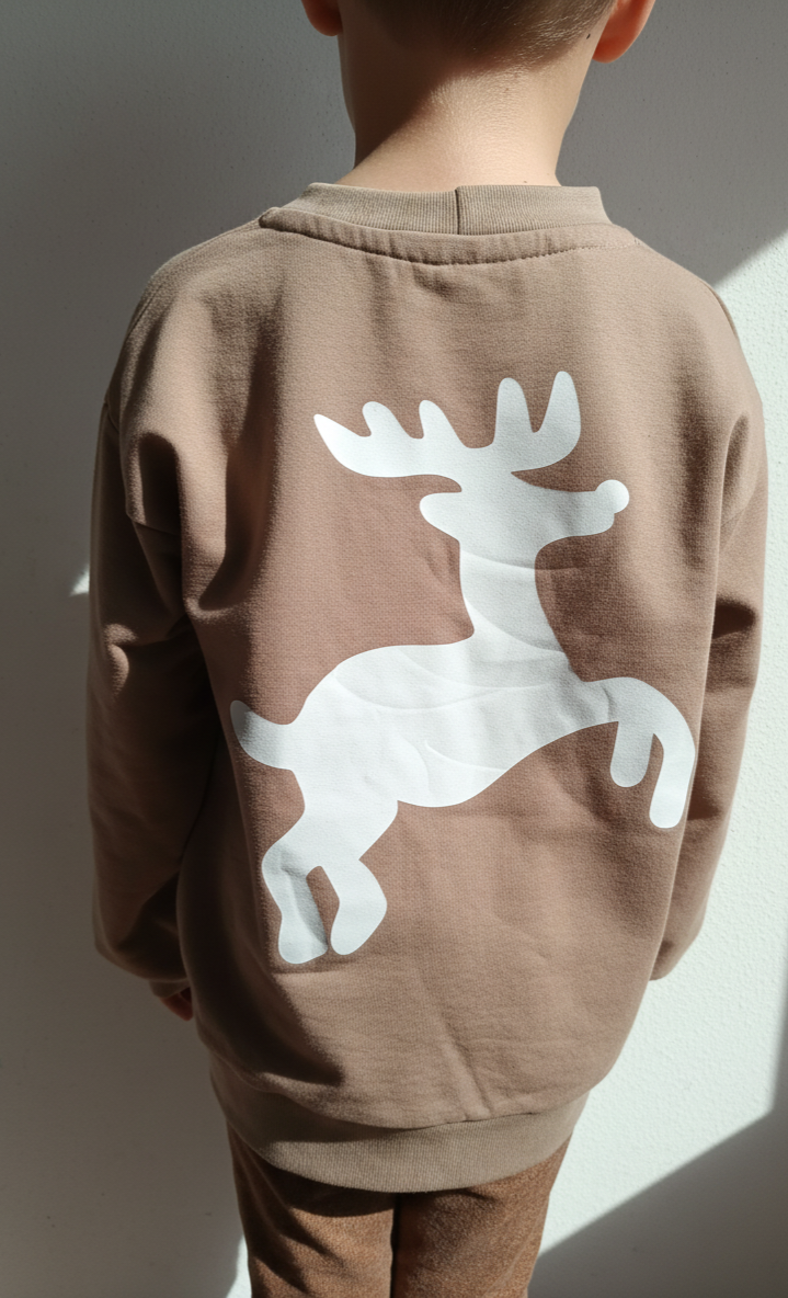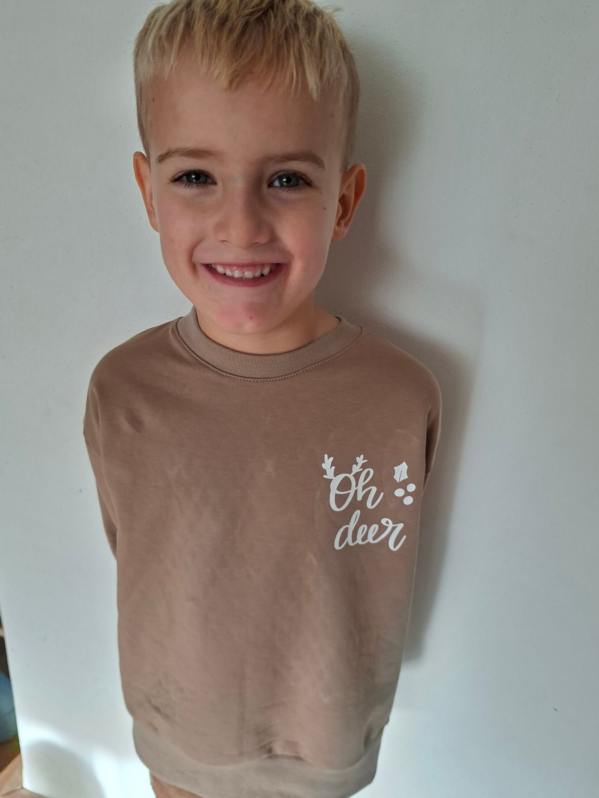 Een stoere sweater met opdruk in glow in the dark. Overdag lijken de opdrukken wit, maar in het donker lichten ze op! Op de rug staat een rendier en op de voorkant staat 'Oh Deer'. Let op: opdruk niet strijken, binnenste buiten wassen, niet in de droger.