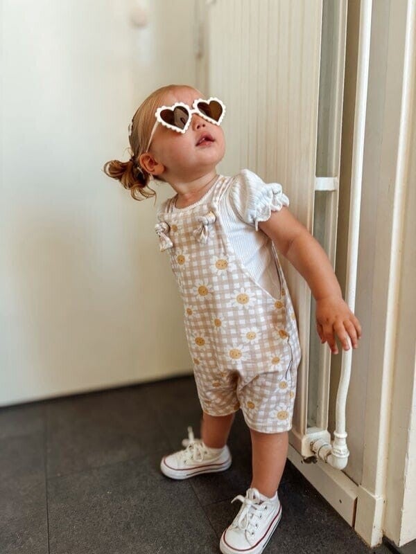 Een heerlijk printje voor een kort tuinbroekje! Bloemetjes op een zoet ruitjespatroon. Knoopsluiting bovenaan, korte gezoomde pijpjes.