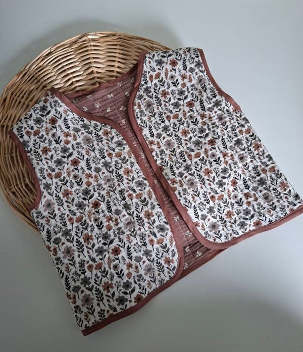 Een prachtig gilet dat je aan 2 kanten kunt dragen. Aan de ene kant een lichte stof met talloze bloemetjes, aan de andere kant een roodbruine stof met kleine bloemetjes.
